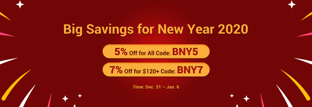 Two discount codes:5% off code "BNY5" for All orders.7% off code "BNY7" for $120+ orders.