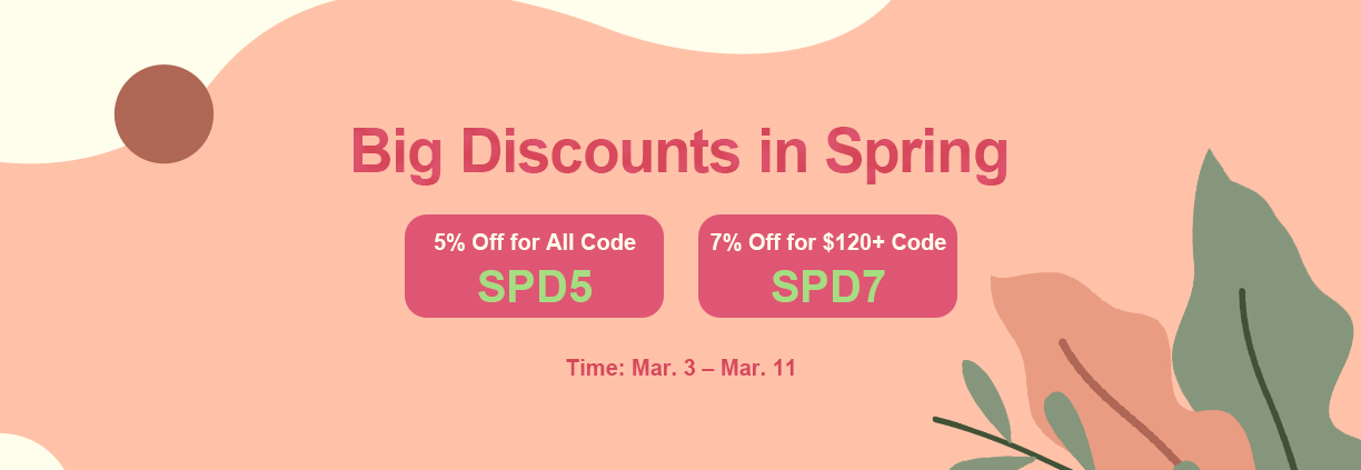 Two discount codes available:5% off code "SPD5" for All orders.7% off code "SPD7" for $120+ orders.
